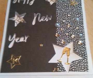 5.Trim or cut away excess paper. Open card completely and lay on your cutting platform to position the “Happy New Year”and star dies from the December “Love from Lizi”kit, or 3 different sizes star dies if you weren’t able to grab the kit. *Tip* Use the cutting side UP of the die so you don’t pull or scratch you paper.